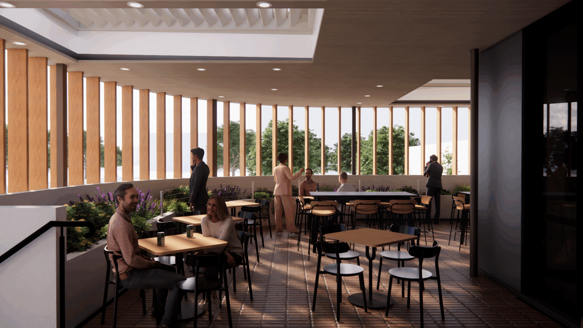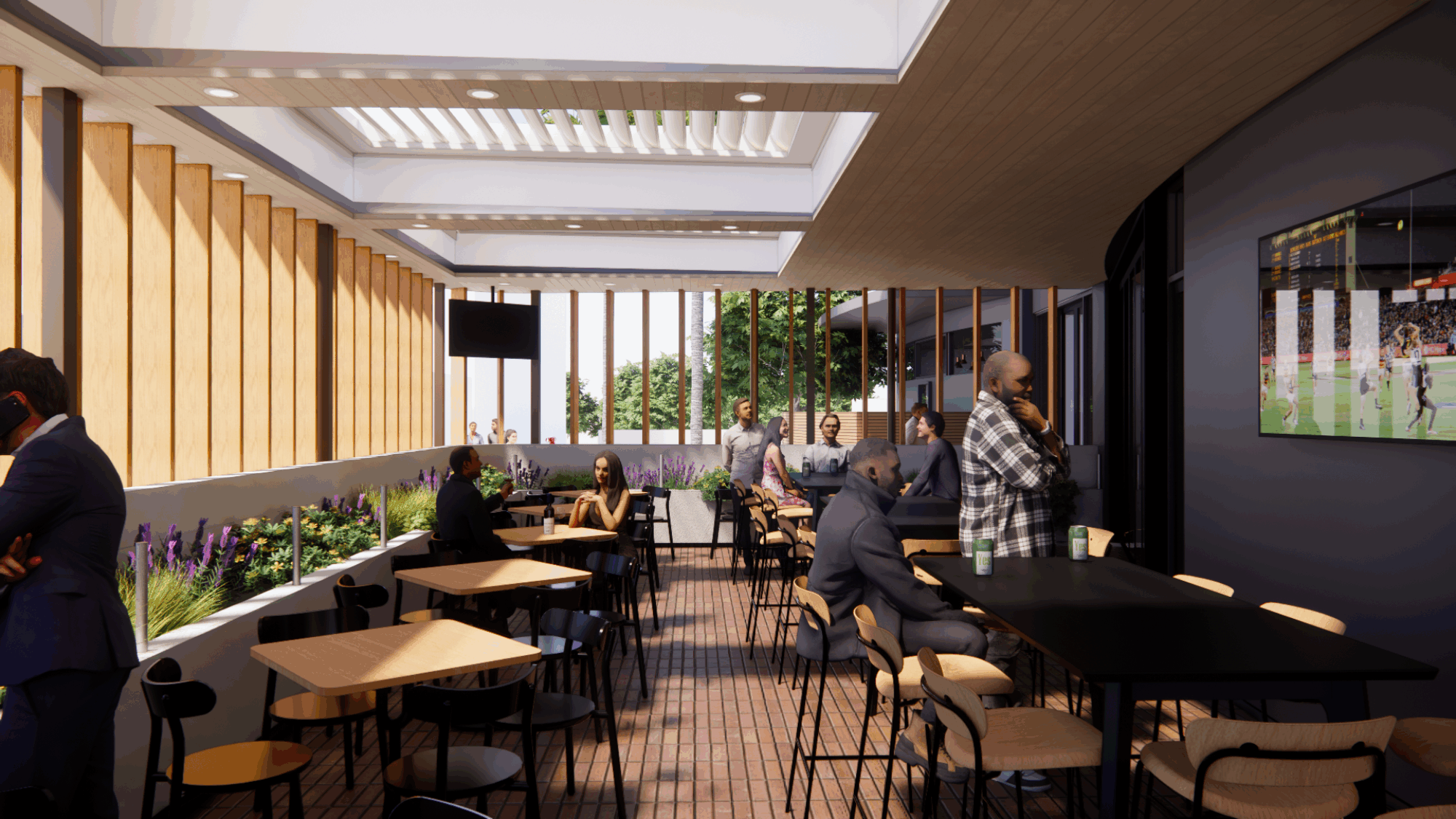Think timber tones, soft natural light, generous greenery and open-air awnings that shift seamlessly with the seasons. A place that feels breezy on warm days, cosy during footy season, and always perfect for catching up with friends.
