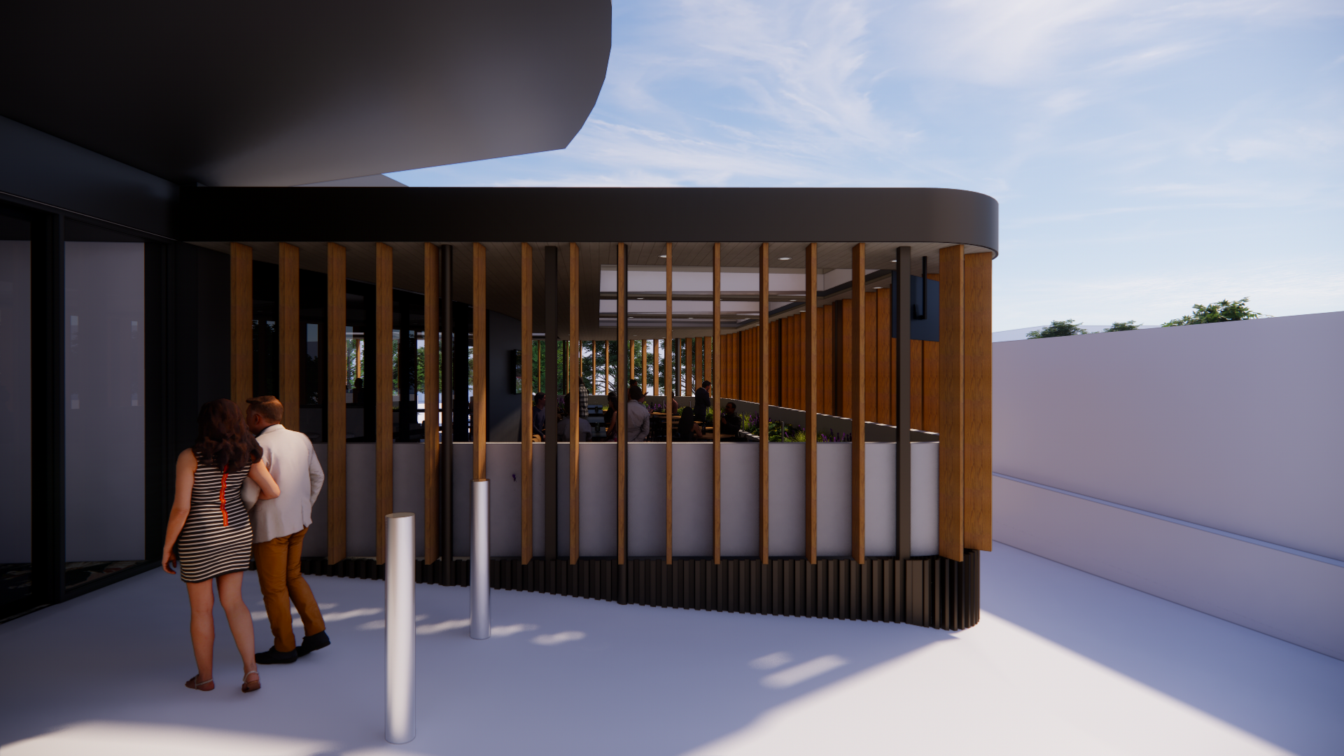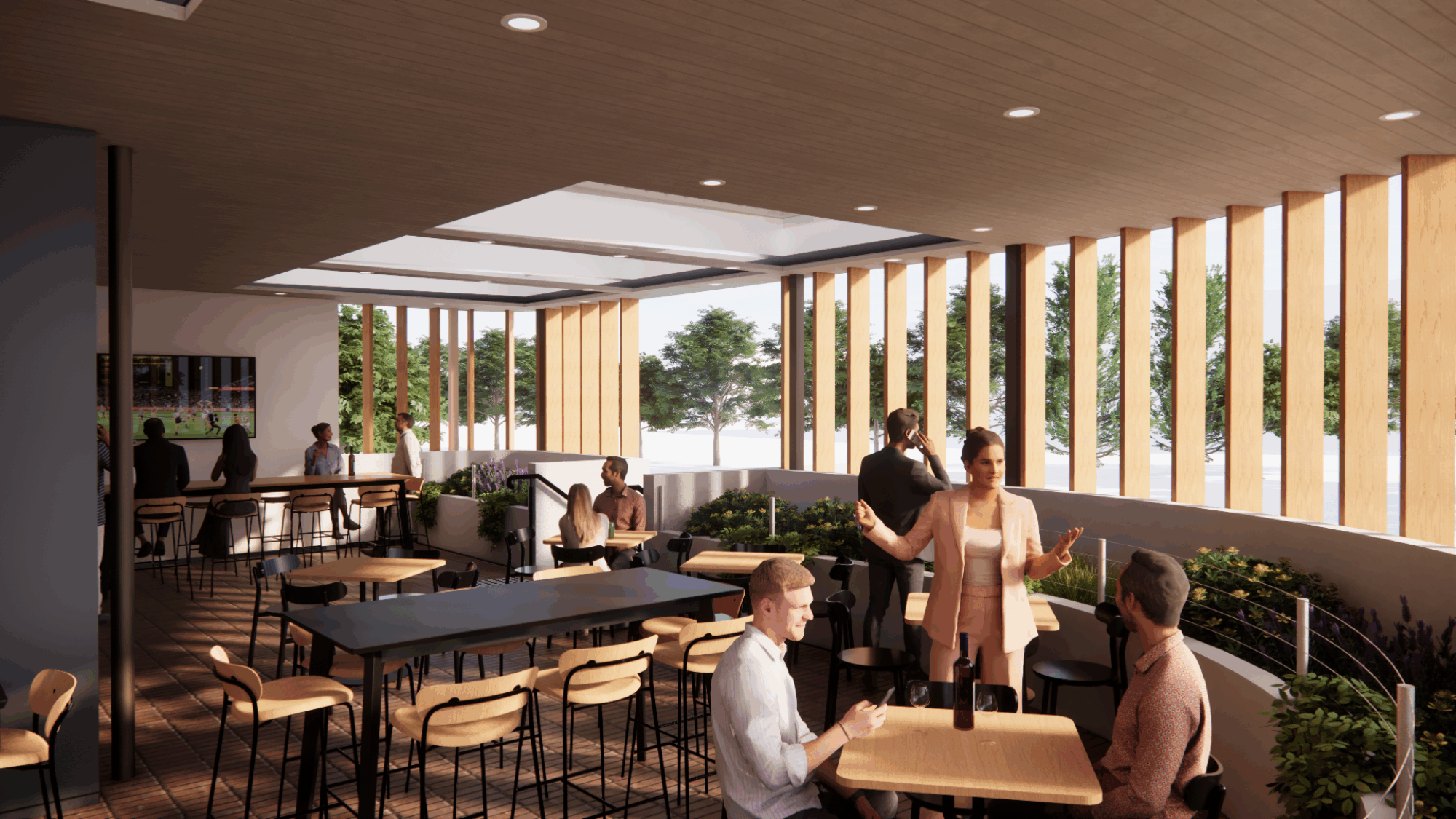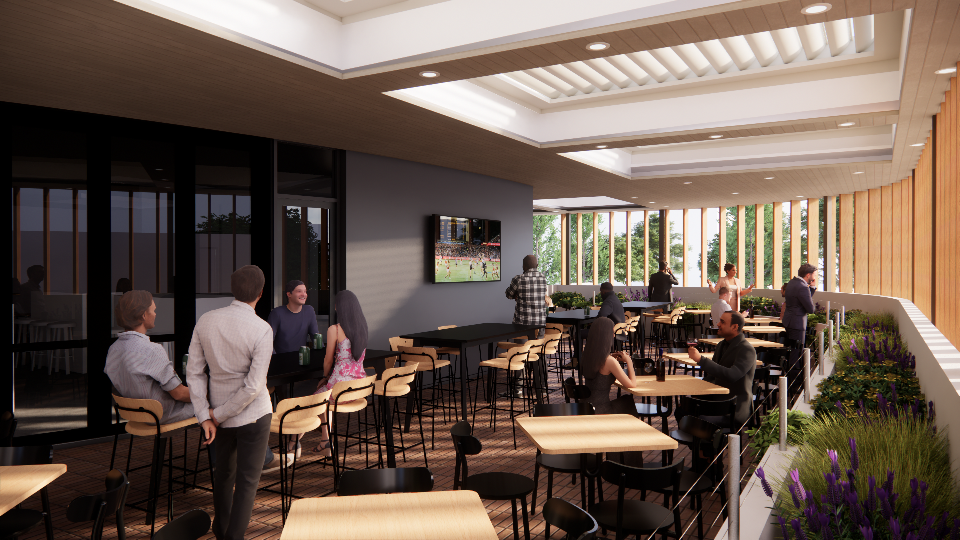 Think timber tones, soft natural light, generous greenery and open-air awnings that shift seamlessly with the seasons. A place that feels breezy on warm days, cosy during footy season, and always perfect for catching up with friends.