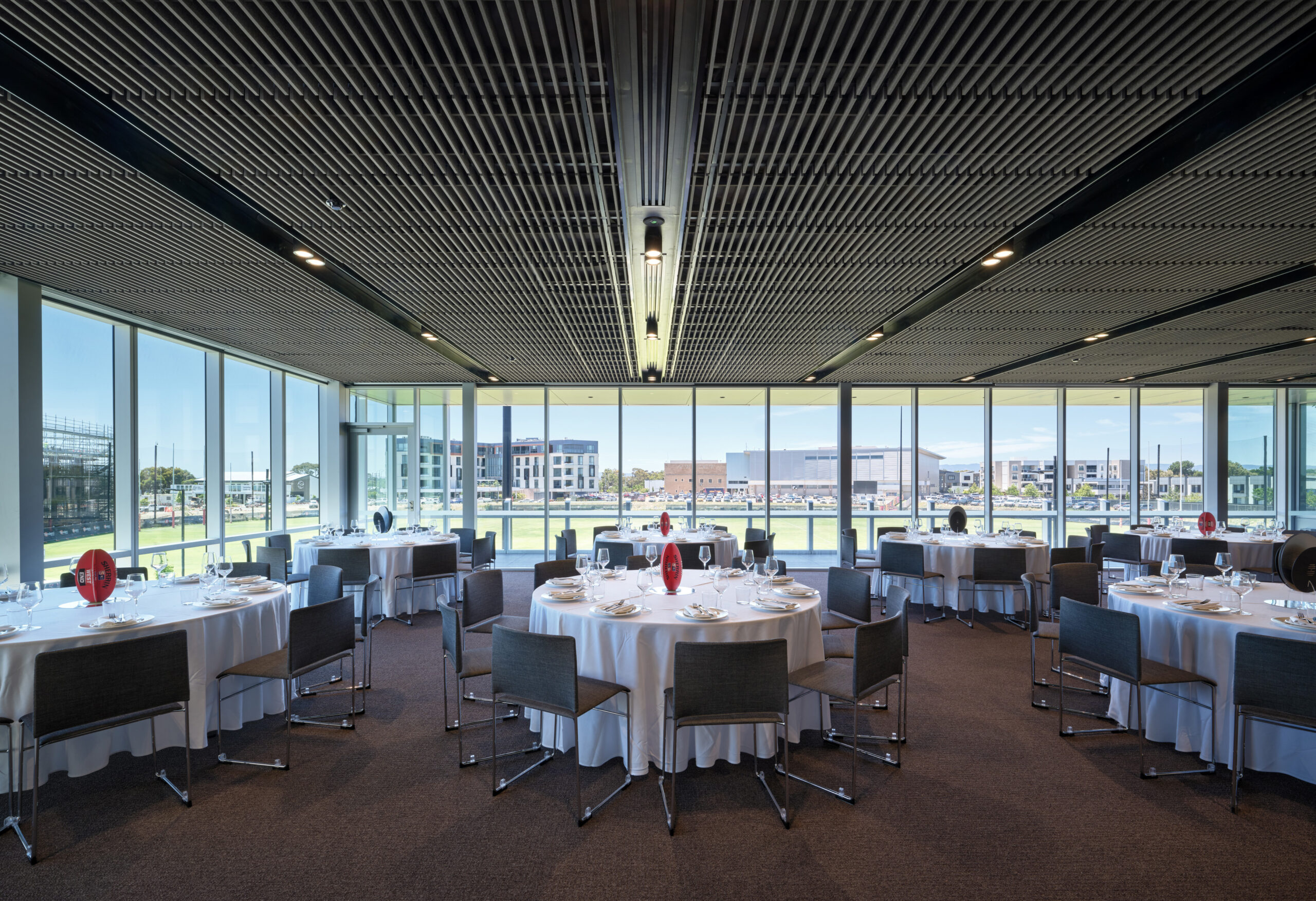 Featuring sweeping views over the historic grounds of Football Park, the Oval View Room will be our premier space for large-scale events, corporate training days, sit-down dinners, or elegant cocktail functions. Featuring full AV capabilities, flexible configurations, and catering by the Mosaic Hotel, this space will deliver professionalism with a stunning backdrop.